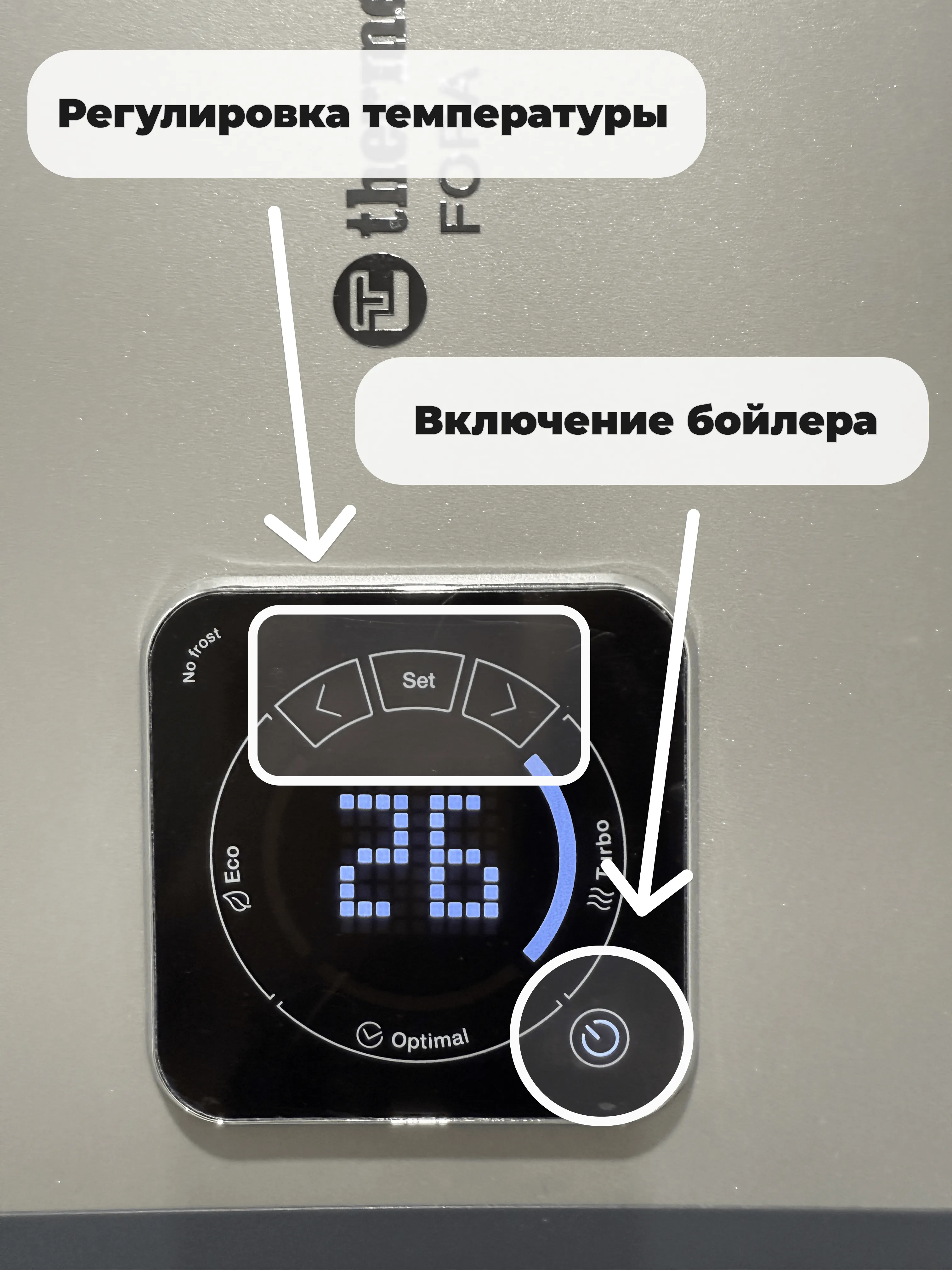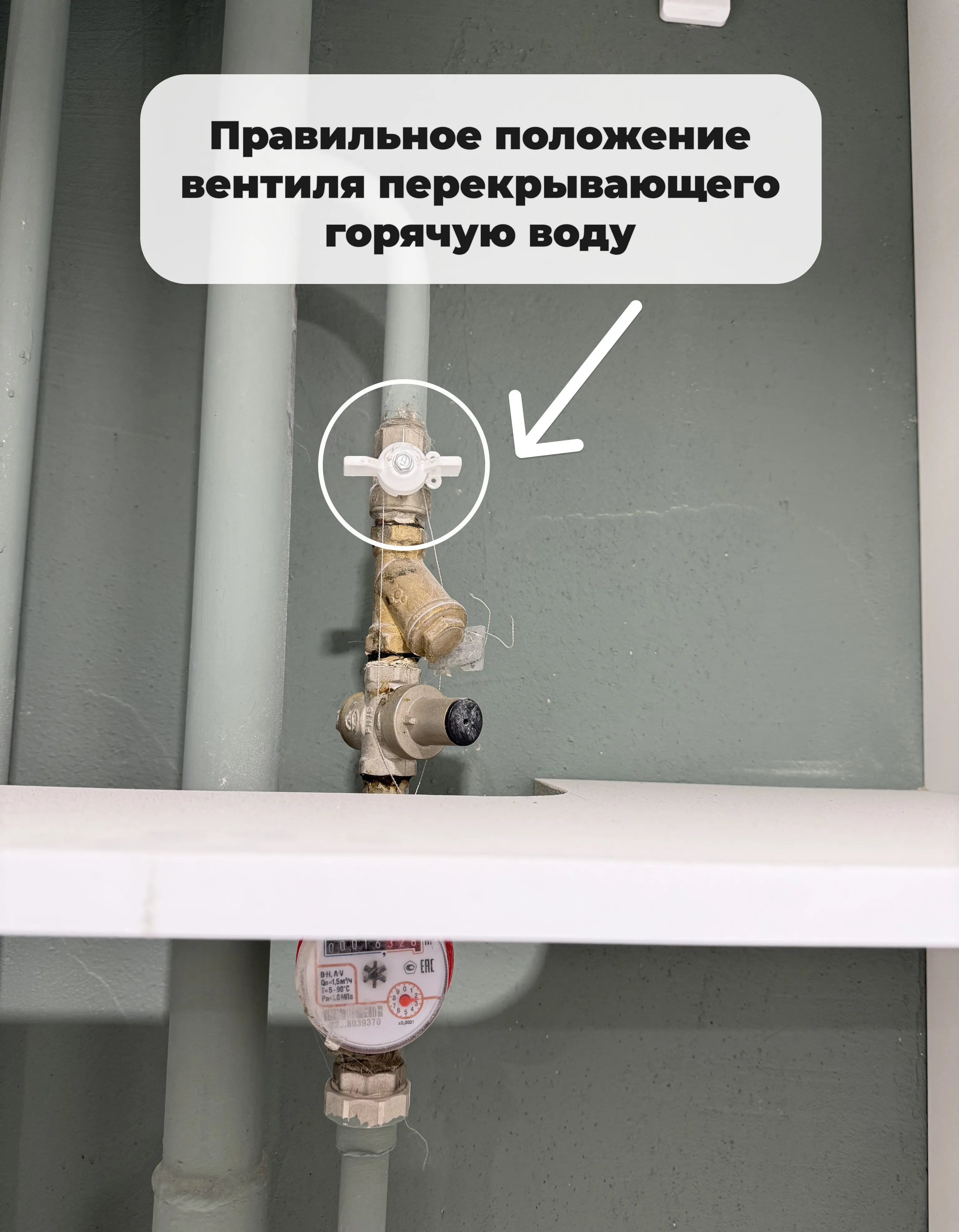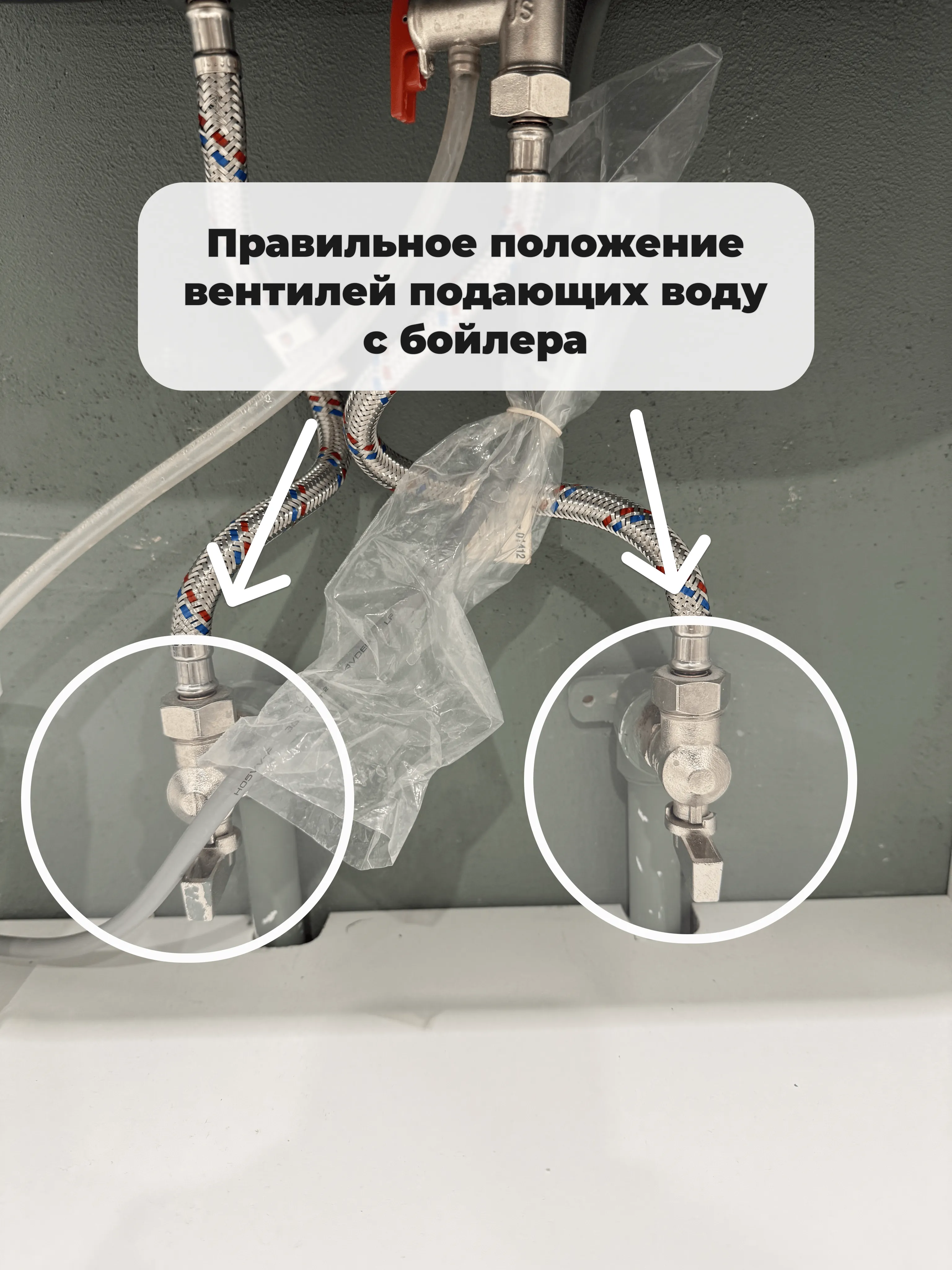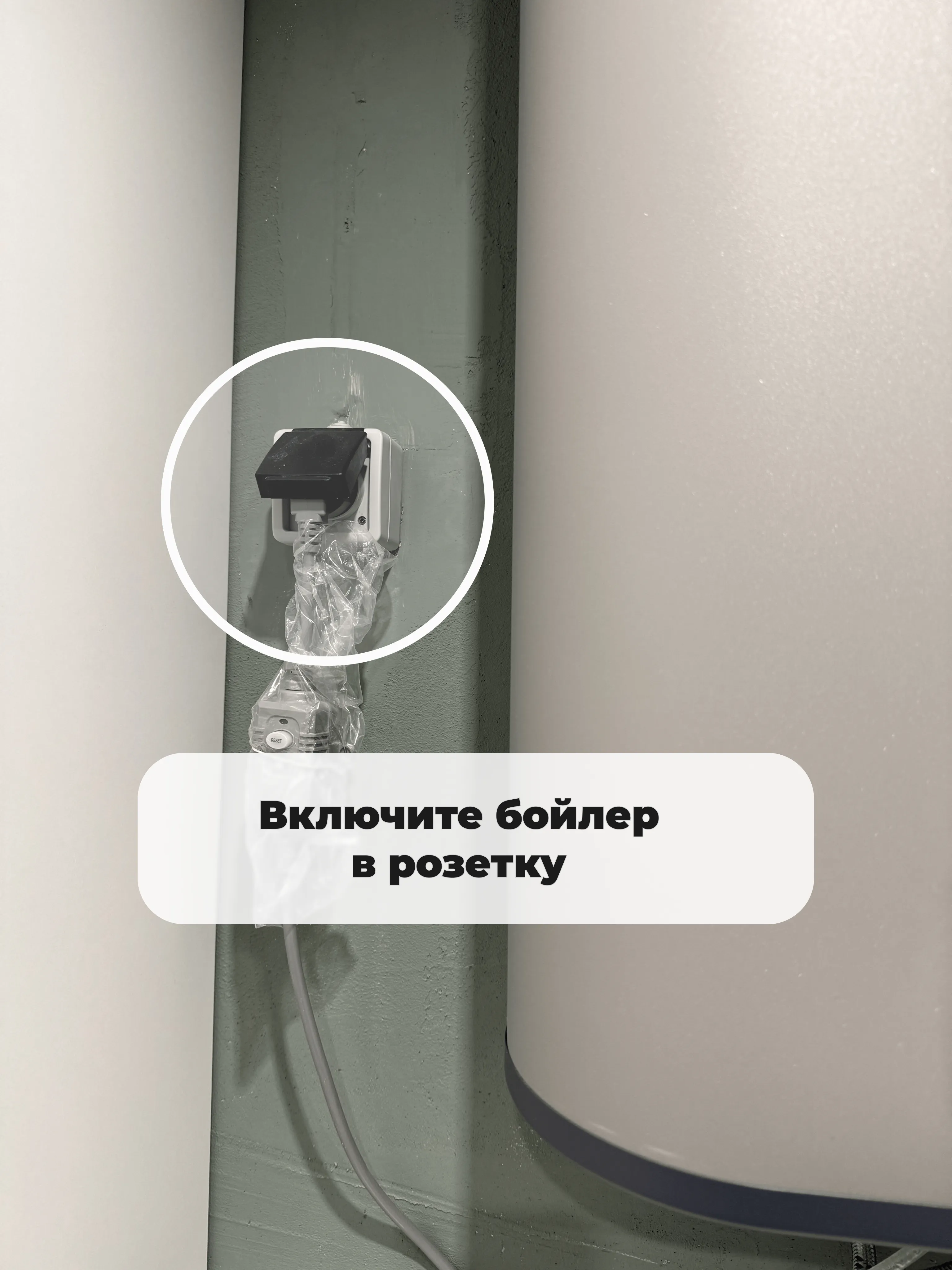 1. (Фото 1) Перекройте подачу горячей воды (труба в шкафчике у стены). 2. (Фото 2) Откройте краны подачи воды с бойлера (шкафчик рядом с душевой). 3. (Фото 3) Подключите бойлер к питанию, вставив вилку в розетку. 4. (Фото 4) Включите бойлер и настройте температуру на цифровой панели.