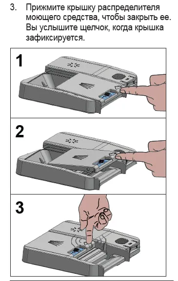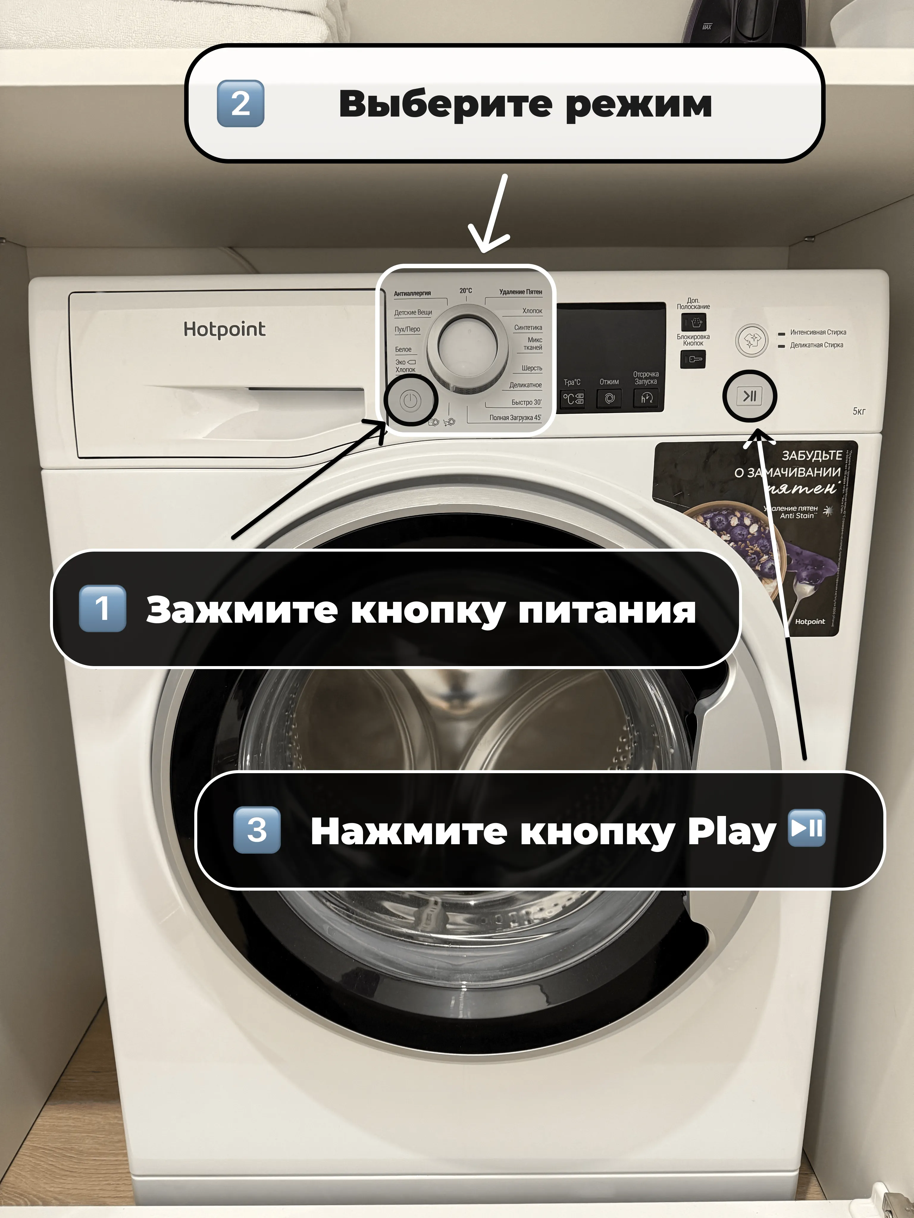 1. Включите стиральную машину, зажав кнопки питания. 2. Установите режим стирки 3. Нажмите "Play" ⏯️