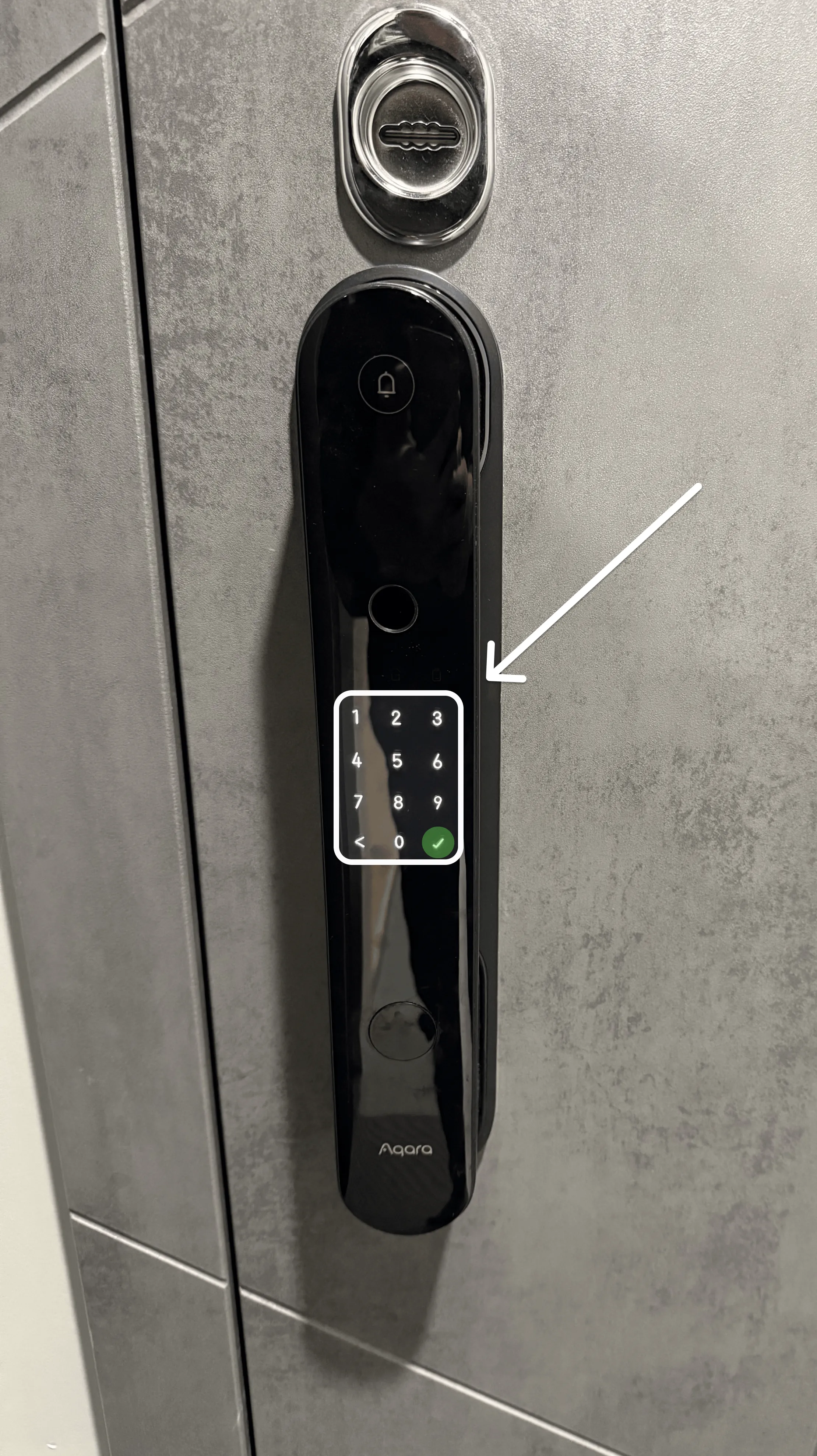 1. Прикоснитесь к замку в зоне, выделенной на фото. Появится цифровая панель для ввода пинкода. 2. Введите пинкод из сообщения с информацией о заселении. 3. Нажмите галочку (✓) для входа.
