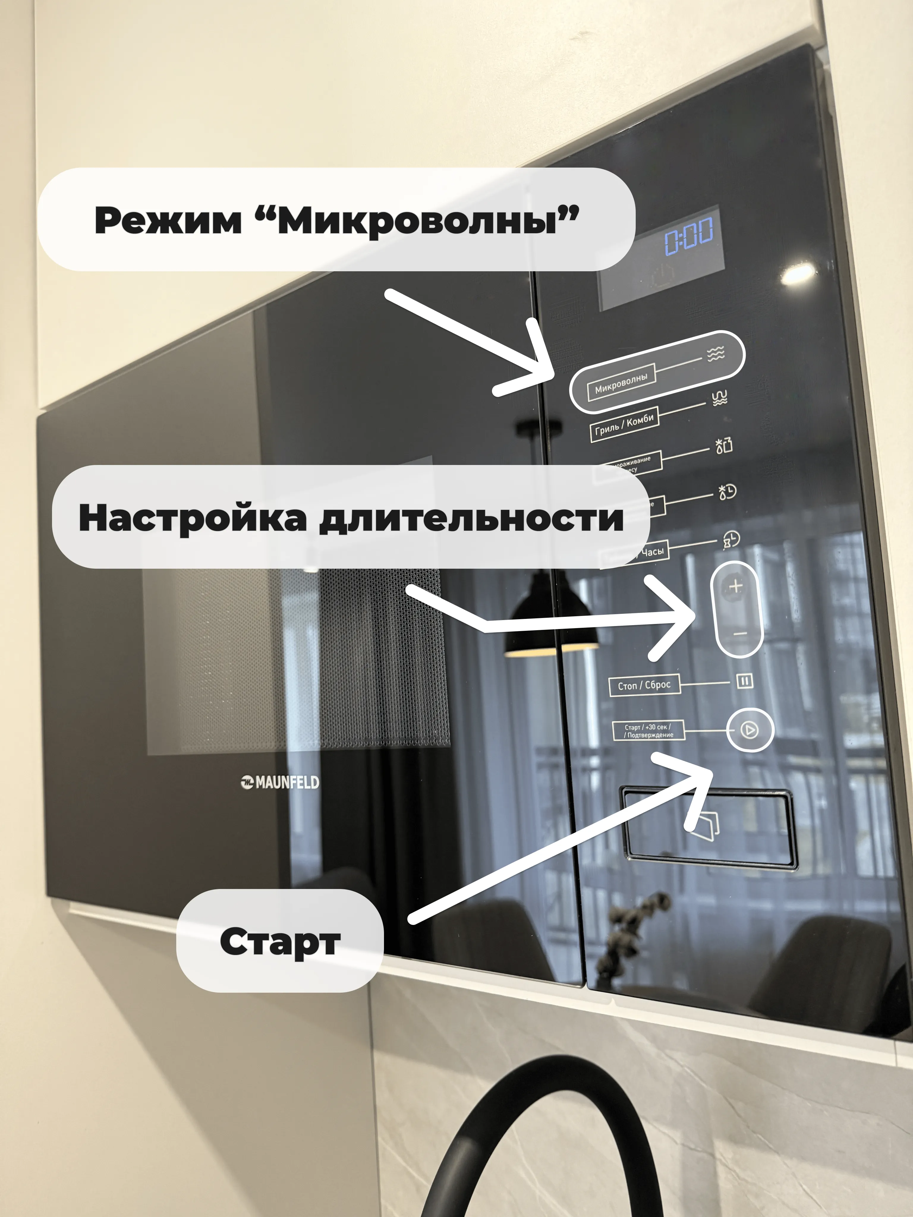 1. Выберите режим "Микроволны" 2. Установите необходимую длительность разогрева, путём нажатия на кнопки: "+" и "-" 3. Нажмите "Старт"