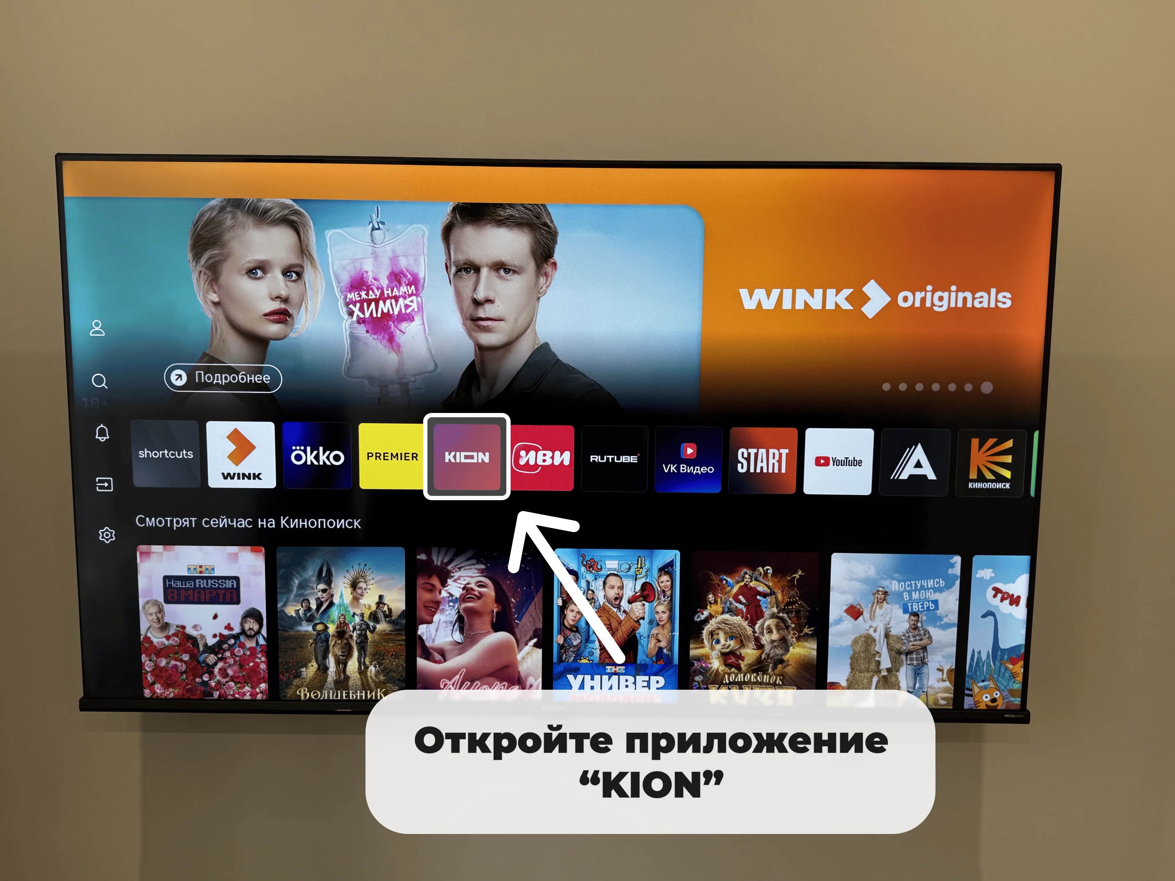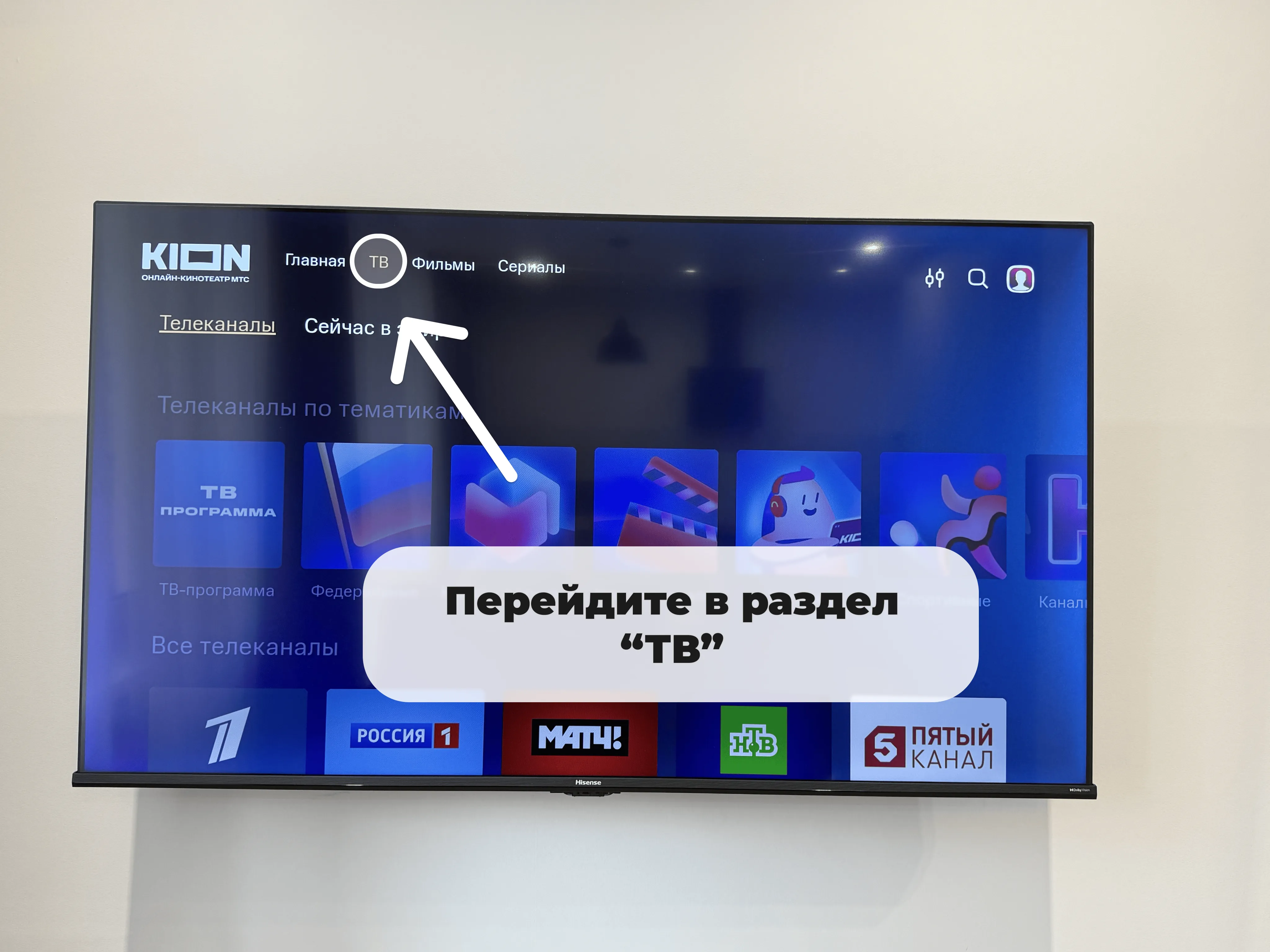 1. В главном меню откройте приложение "KION" 2. Перейдите в раздел "ТВ" 3. Выберите интересующий Вас телеканал